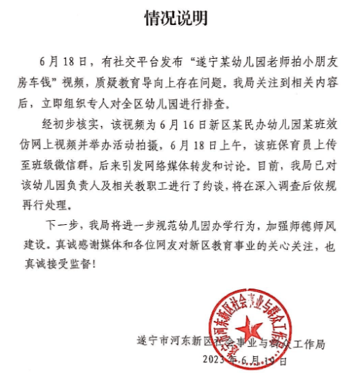 6月18日,有社交平台发布“遂宁某幼儿园老师拍小朋友房车钱”视频,质疑教育导向上存在问题。我局关注到相关内容后,立即组织专人对全区幼儿园进行排查。