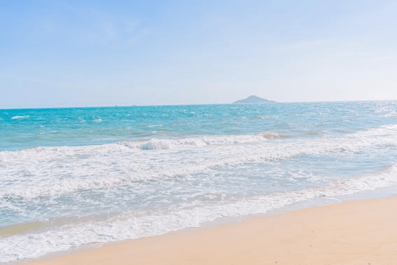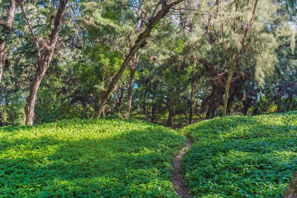 穿过平坦的绿草地,隐秘的蓝色藏在深绿的林网间,小路的尽头就是辽阔的大海。走出小路,看见的便是街墙壁画上描绘的海天一色,海风穿林过,呼啸而过留下的是静谧。