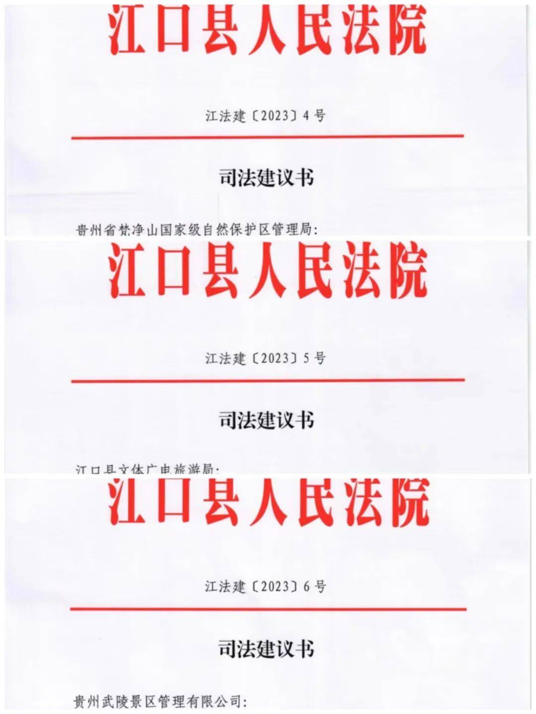 针对事件所反映出来的梵净山保护及管理问题,我院依法向贵州省梵净山国家级自然保护区管理局、贵州武陵景区管理有限公司、江口县文体广电旅游局分别发出司法建议。建议各部门围绕自身工作职责和管理职能,加大梵净山保护宣传力度,加强梵净山的巡查管理、保护措施及设施建设,并明确落实时限。