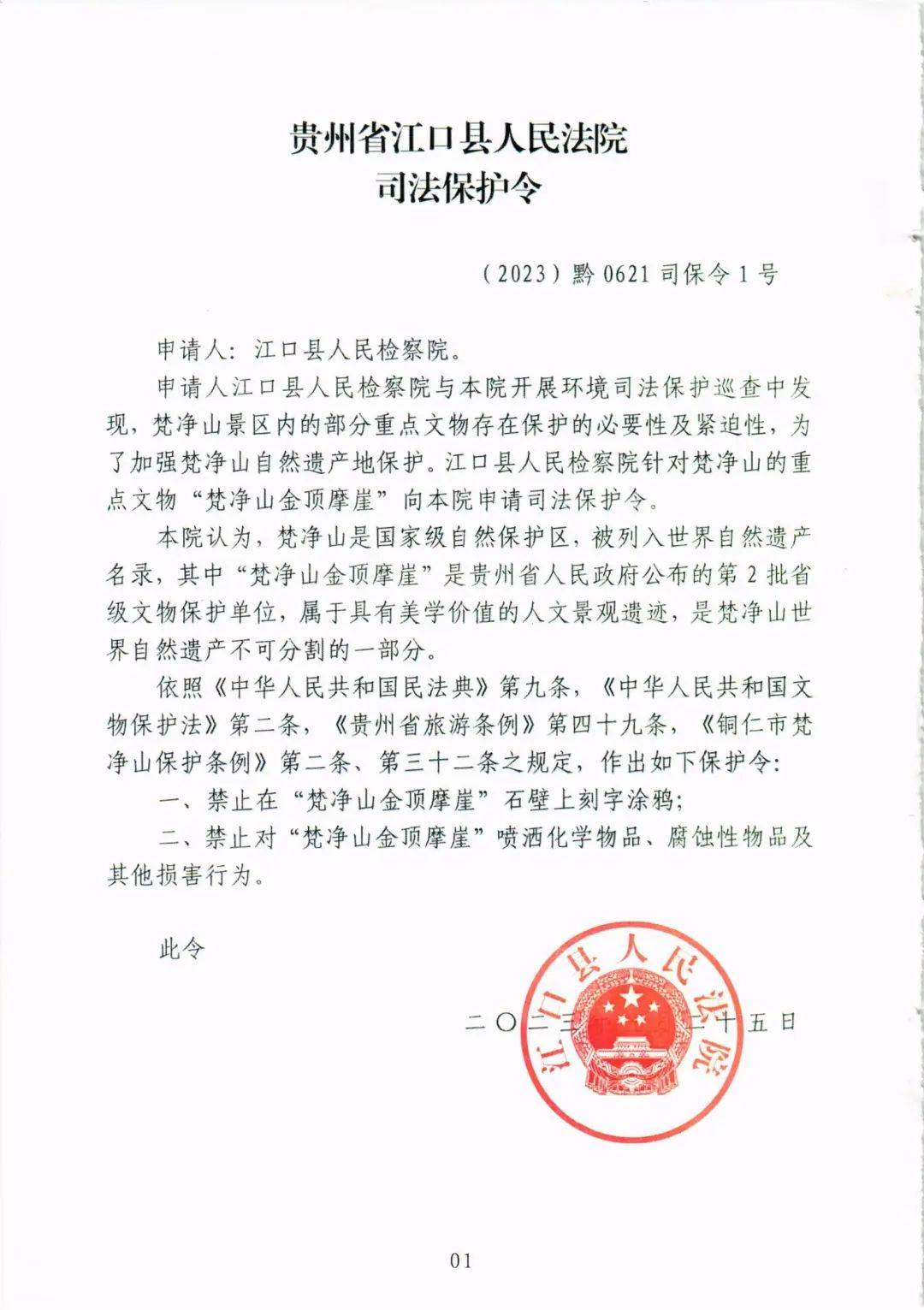 梵净山是国家级自然保护区、国家5A级景区,2018年7月被列入世界遗产名录,习近平总书记专门为梵净山的保护管理工作做了重要批示。2023年5月25日围绕梵净山重点文物及自然遗产保护,我院发出了首批司法保护令,范围包括梵净山金顶摩崖、敕赐碑、金顶古庙群、梵净山碑林。梵净山金顶摩崖是具有美学价值的人文景观,省级文物保护单位,属于梵净山世界自然遗产不可分割的一部分,一旦损害难以修复。