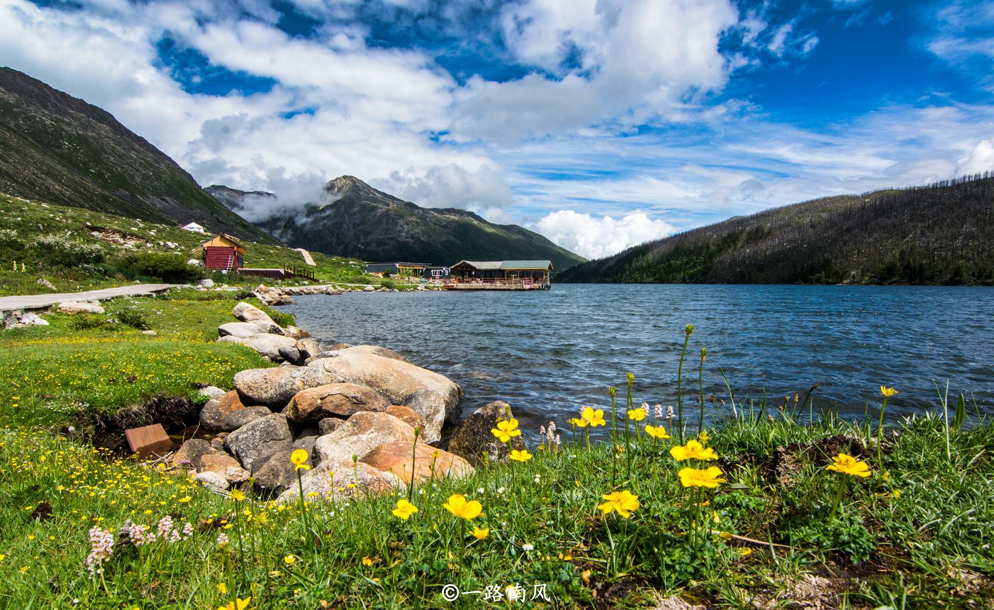 到了夏天,木格措湖边的小花迎风怒放,碧湖、蓝天、白云、群峰、雪山、草地、鲜花构成一幅唯美的、大气的画面,让人迷恋不已。