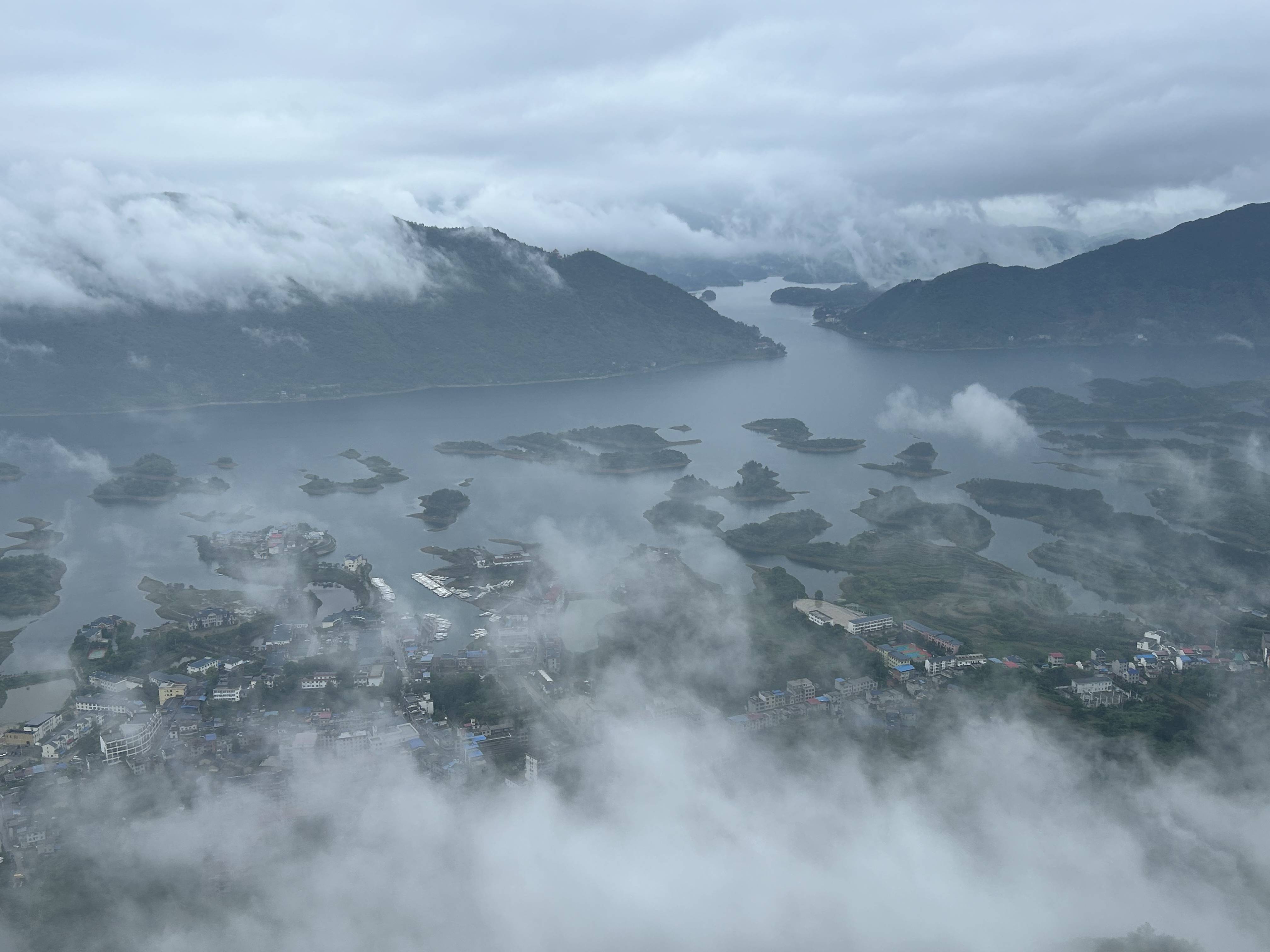 6月19日,一场大雨过后,仙岛湖突然从云雾中露出。 澎湃新闻记者 王珏玮 图