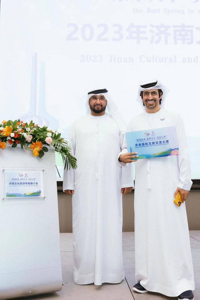 并现场聘任迪拜硅谷绿洲自贸区主席朱马·阿拉木图、阿联酋富吉拉酋长国文化遗产部媒体总监萨中华为“好客山东泉甲天下美美与共”济南国际文旅交流大使。