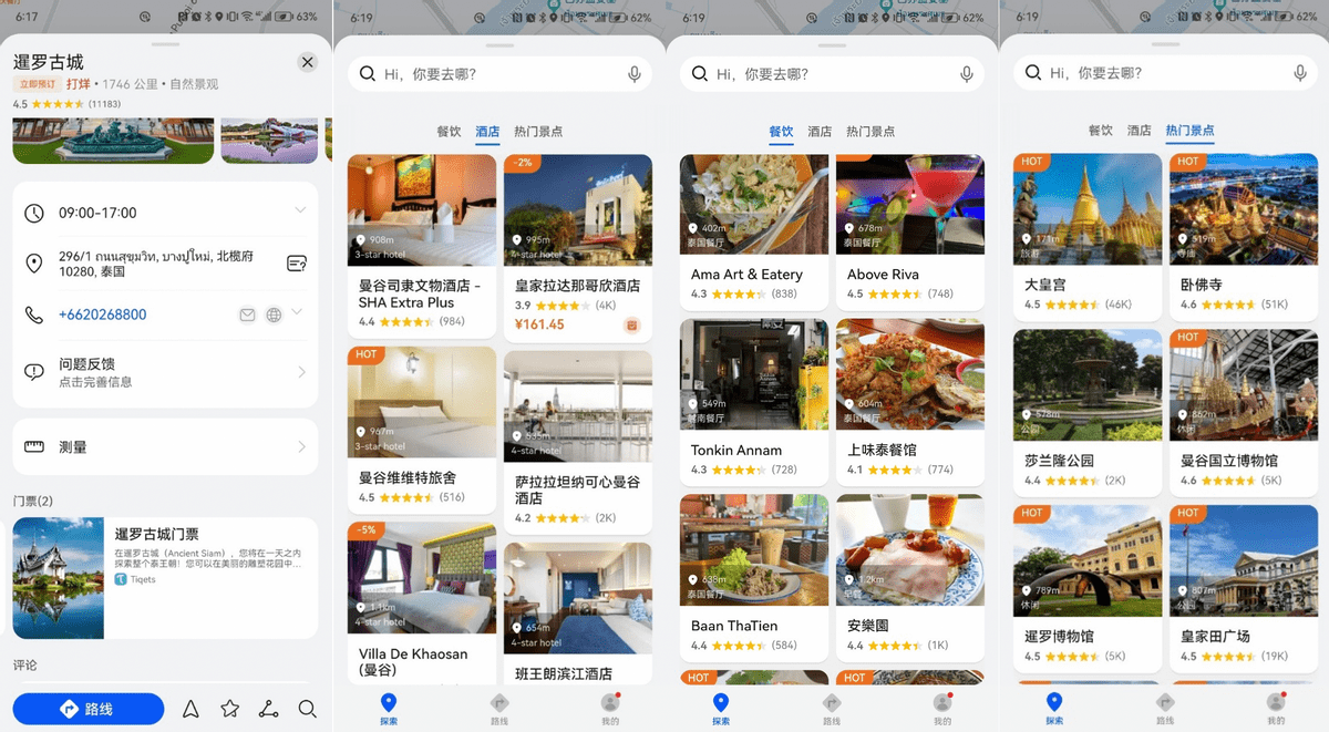 Petal Maps还支持推荐当前位置附近的酒店、餐厅、景区门票等信息,下拉详情页,点击就能跳转到对应应用预定。