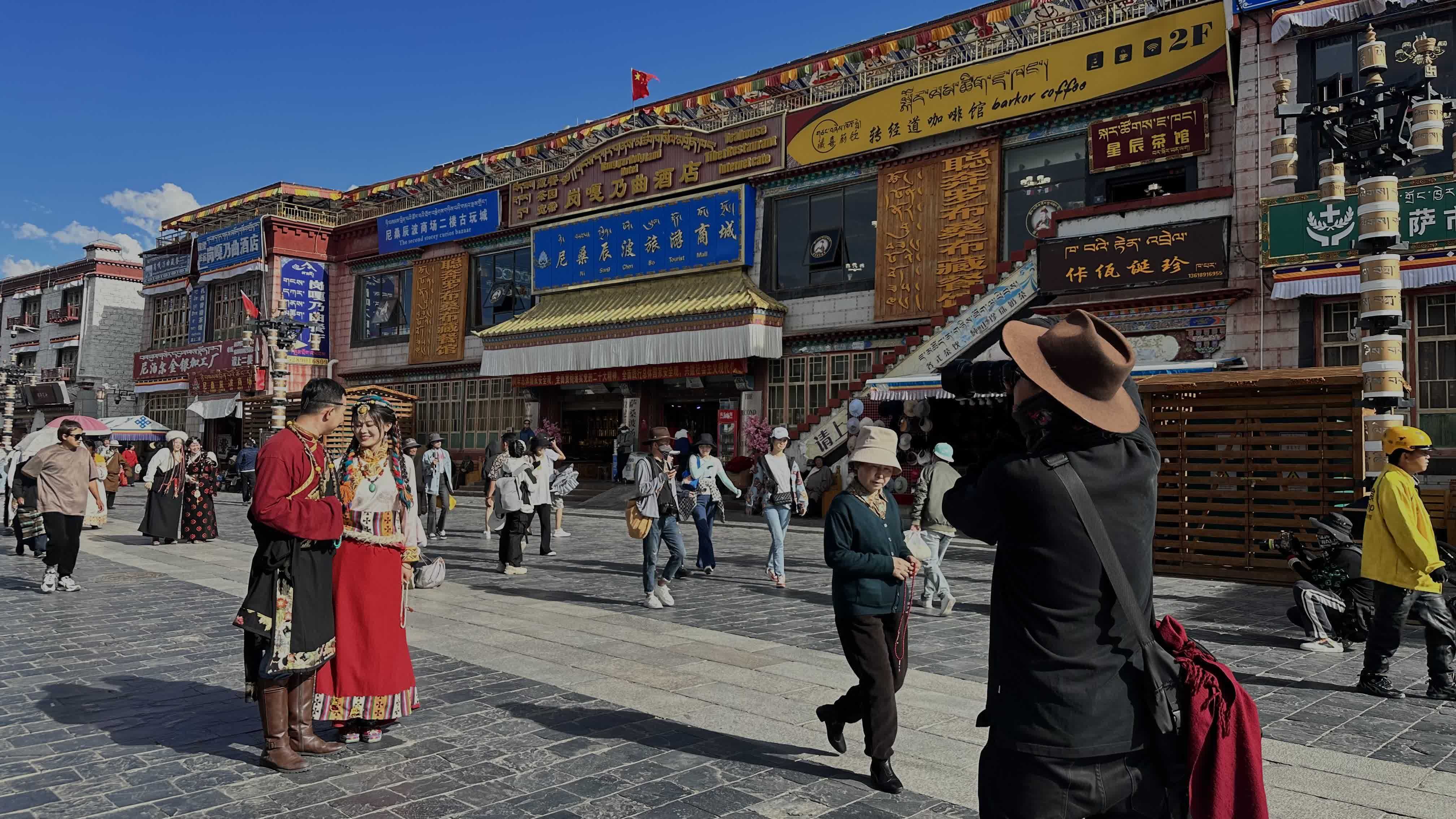 拉萨八廓街上,游客在拍摄藏服写真。中新网记者 朱延静 摄