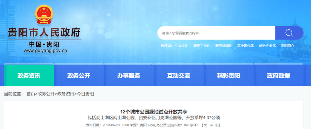 为拓展公园绿地开放共享新空间,满足人民群众亲近自然、休闲游憩、运动健身的新需求新期待,6月19日,由贵阳市综合行政执法局主导,经过前期实地调研和后期完善配套服务设施, 贵阳市12个城市公园绿地试点开放共享,新增开放共享面积5.8公顷,其中开放草坪4.37公顷。