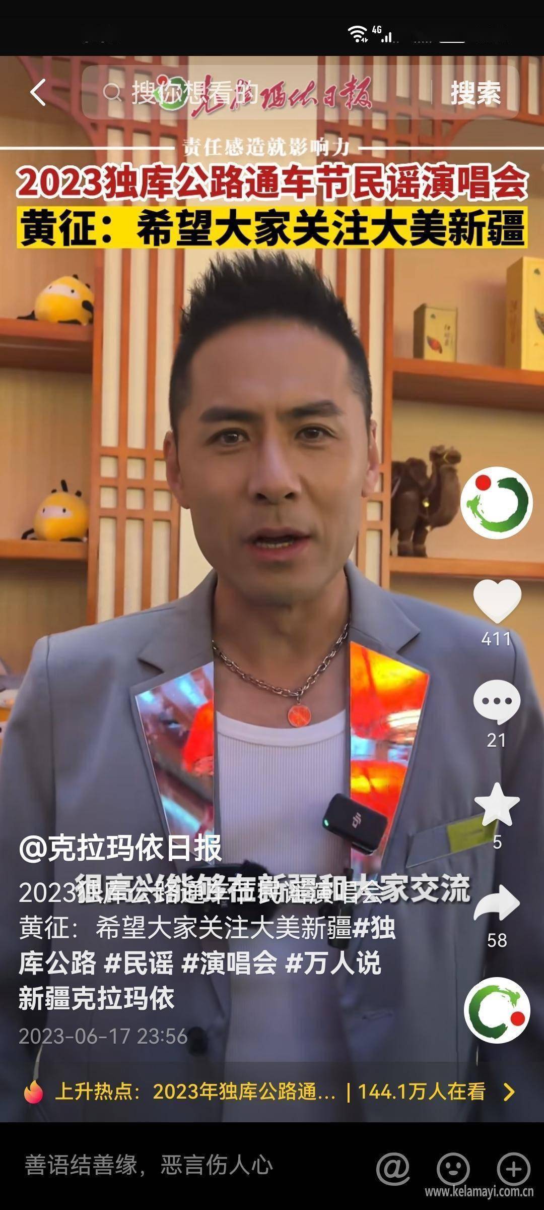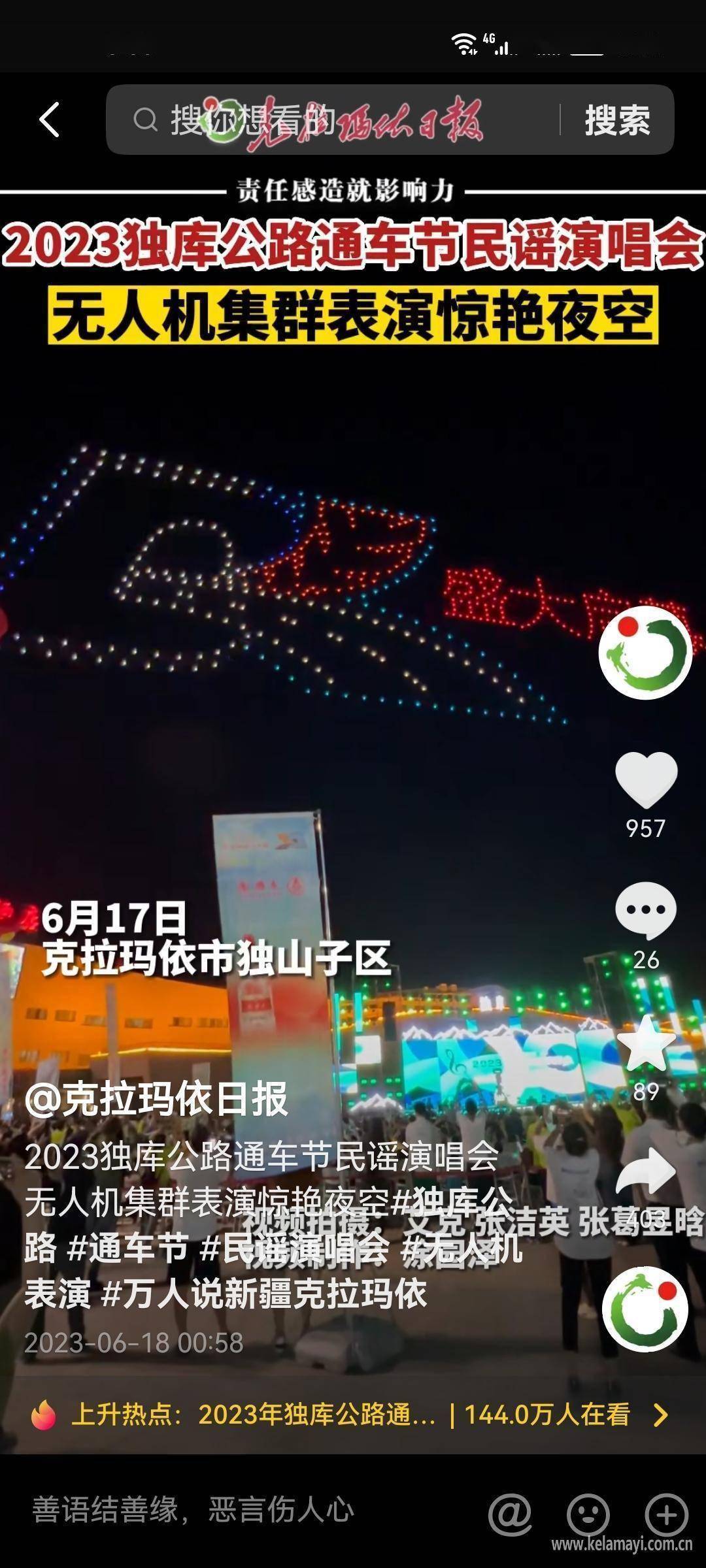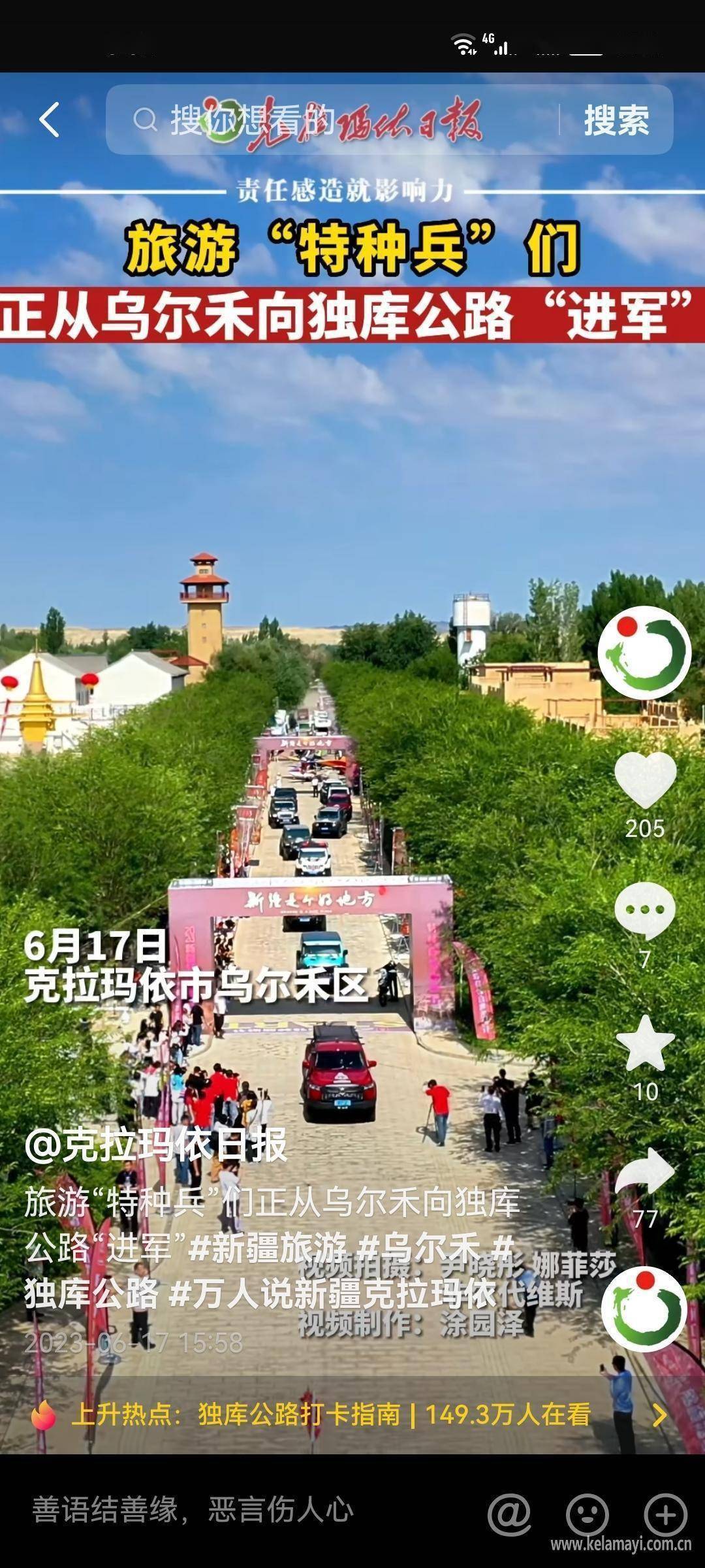 围绕旅游节的开幕式、签约仪式、特种装备展与通车节上的民谣演唱会、嘉宾专访、“克拉玛依喜欢烤鱼”亮相等一系列活动,采编团队共制作发布27个视频,其中,《来2023新疆特种旅游节——来最时尚的城 做最靓的仔!》《2023新疆特种旅游节 记者带你体验低空飞行》《2023独库公路通车节民谣演唱会 好久没有这么嗨啦!》等短视频用独特视角,生动呈现了克拉玛依市别样的旅游资源,而通车节民谣演唱会上,黄征、尕尕、艾尼瓦尔等歌唱嘉宾的祝福视频则带领网友身临其境感受现场的热闹氛围。