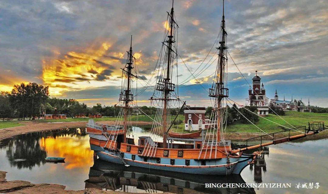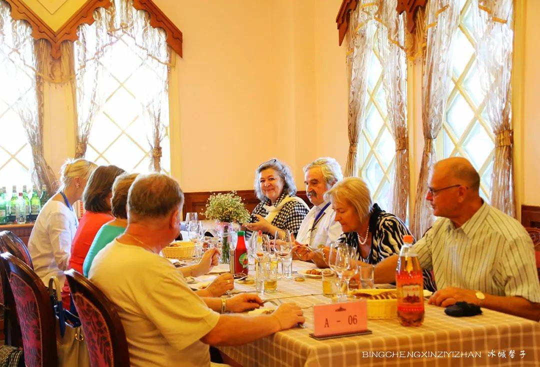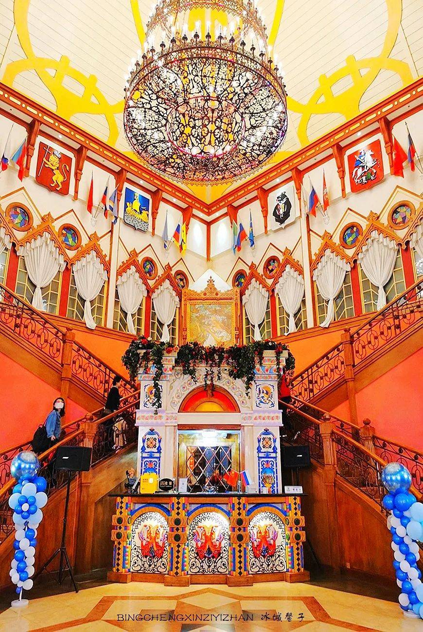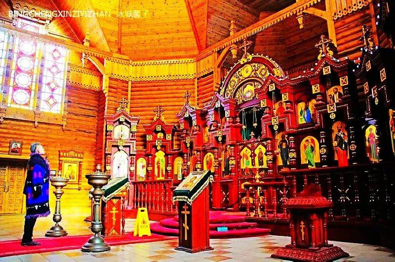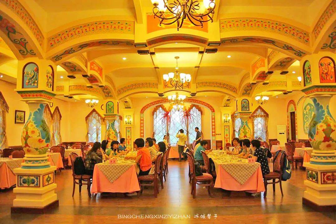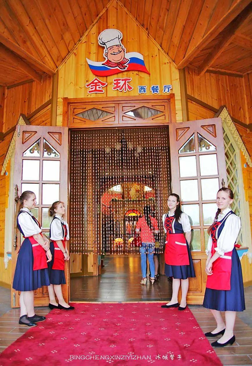 与伏特加酒堡一河之隔有一幢像镶着一个五角形皇冠的俄罗斯木制建筑,它是金环西餐厅,是1913年哈巴史夫斯克博览会上的一个展览馆,展会结束就被拆除了,但伏尔加庄园却让已经消失的建筑获得重生。这里不仅有着优美浪漫的环境,还可以品尝到纯正的俄式大餐。你可以不来吃西餐,但你一来参观下这个国内最美的俄式西餐厅,室内全部是手绘。除大厅外,还有多个风格各异的单间。