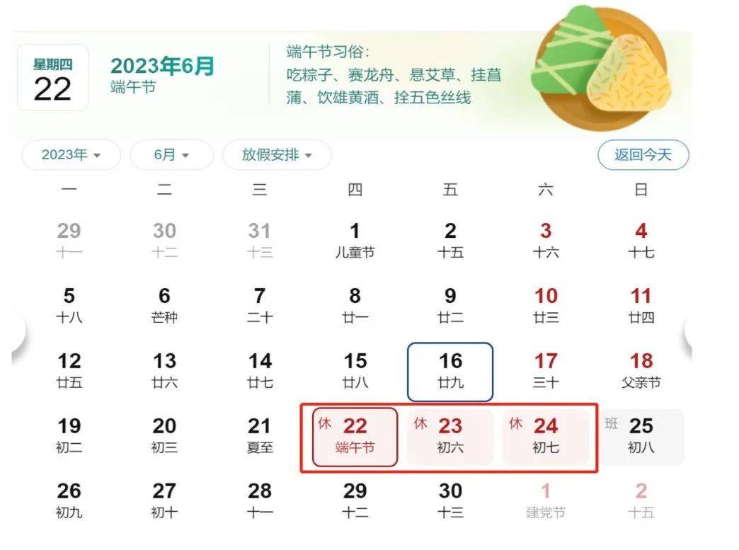 今年端午节假期为 6 月 22 日至 6 月 24 日, 共三天,节日期间高速公路正常收费。 2023年端午节前及期间,天气情况良好,以晴天为主,预计市区热门景区、 商圈、以及近郊短途出行热度较高。
