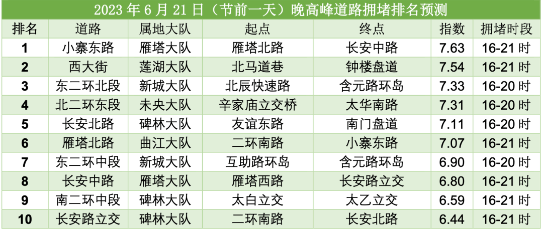 6月21日,星期三,限行 3 和 8。晚高峰将呈现开始时间早、持续时间长的特点。全市南北中轴线,二环路、环城西路等城市主要道路将呈现大流量状态。特别是二环沿线,下午16-20时预计将出现流量高峰,流量较大的收费站多集中在西安周边,出口流量较大的收费站主要有六村堡、曲江、 灞桥、三桥、丈八;入口流量较大的收费站主要有六村堡、曲江、灞桥、三桥、汉城。上述收费站出口流量预计可达日均2.8万辆以上,入口流量达到日均3.0万辆以上。