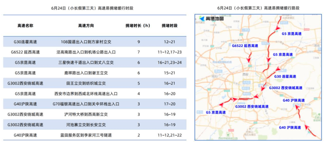 节日期间西安市返程易拥堵缓行的高速主要是:G30 连霍 高速、G6522 延西高速等高速的部分路段。