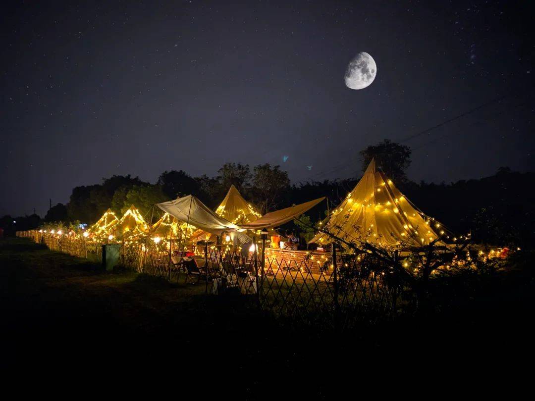 入夜,在一片奇幻光影中,在山坡露营区摆好自带的野餐、帐篷、天幕,来一场野趣中不乏精致的灯光夜餐。