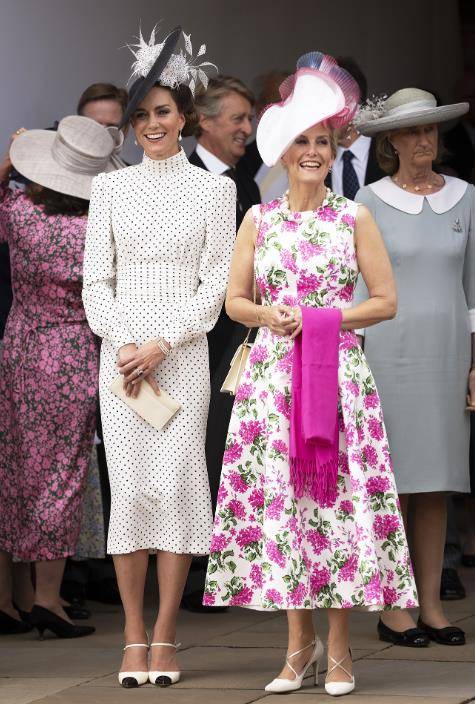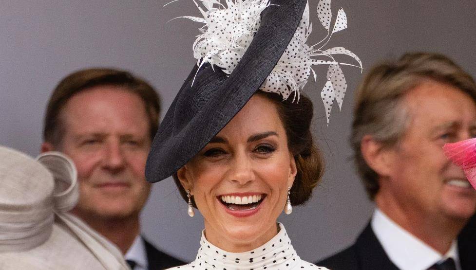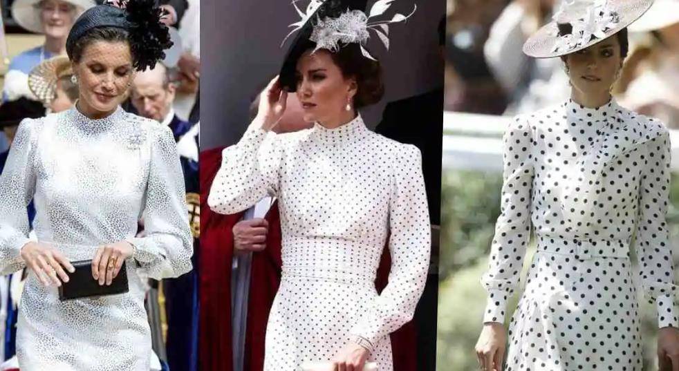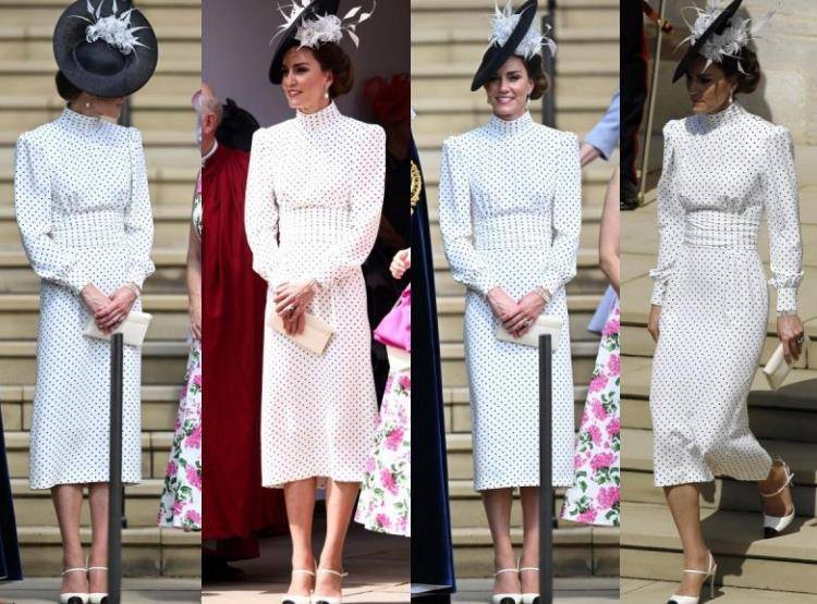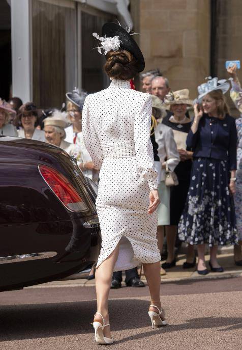嫁入王室十多年的时间,凯特一直扮演重要角色,备受女王和查尔斯的重视。这次的凯特身穿亚历山德拉·里奇设计的黑色圆点长袖白裙,搭配一顶菲利普·崔西设计的帽子。