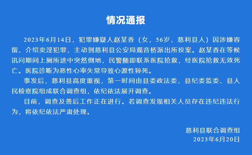 医院诊断为恶性心率失常导致心源性猝死。事发后,慈利县高度重视,第一时间由县委政法委、县纪委监委、县人民检察院组成联合调查组,依纪依法展开调查。