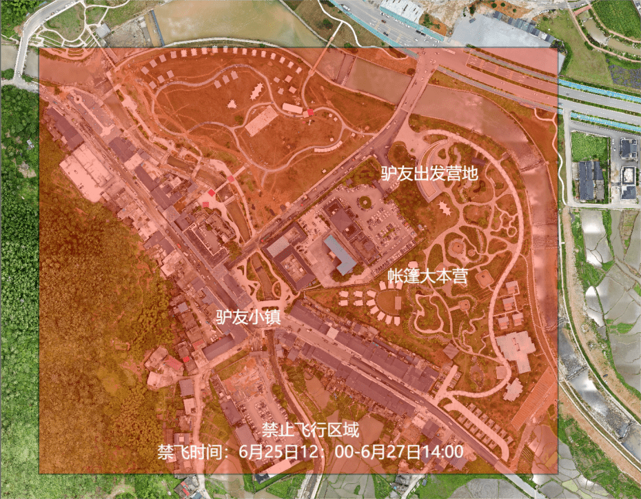 ▲武功山风景名胜区驴友出发营地、驴友小镇、帐篷大本营禁飞区域示意图