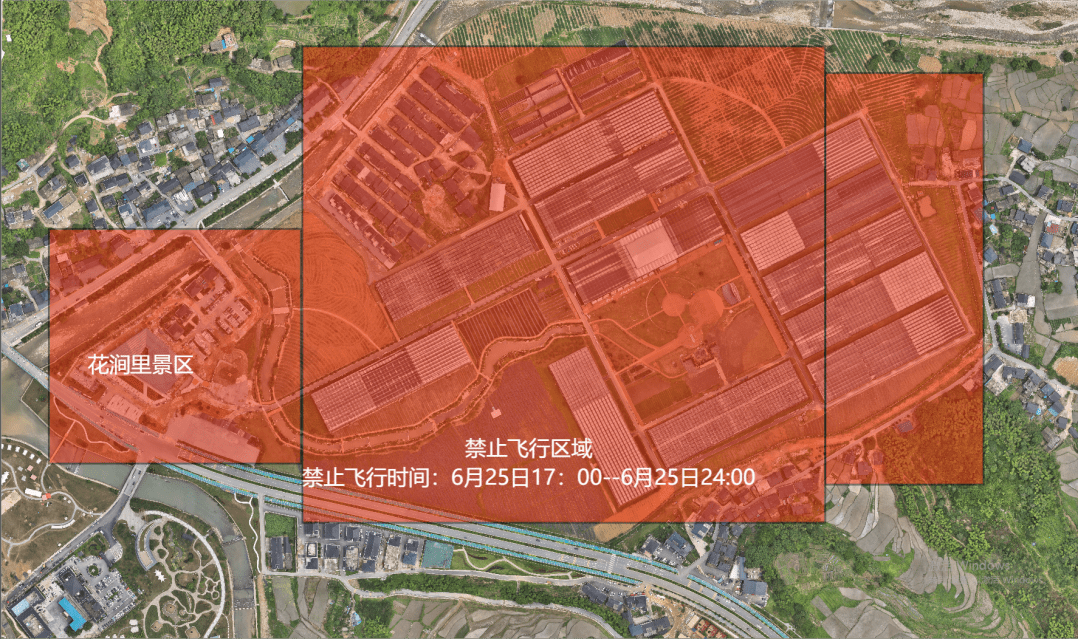 (一)2023年6月25日17:00--24:00时,禁止未经批准的任何单位、组织及个人在花涧里景区区域内飞行和施放无人机等“低慢小”航空器(详见禁飞区域示意图)。