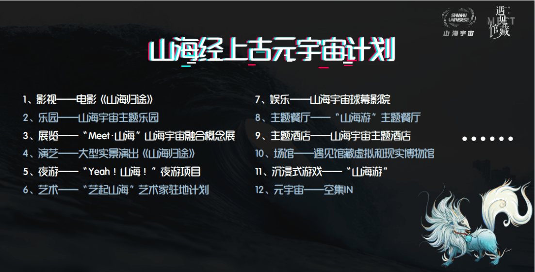 “山海经上古元宇宙计划”依托遇见馆藏旗下原创国潮IP馆藏山海经,全面开启线上"影视+虚拟人矩阵”,线下“主题乐园+文化体验”的板块组合,具体包含电影——《山海归途》、展览——“MEET山海·山海宇宙融合概念展”、乐园——山海宇宙主题乐园、娱乐——山海宇宙球幕影院、演艺——《山海归途》、餐饮——山海游沉浸式餐厅、住宿——山海宇宙主题酒店、艺术——“艺起山海艺术家驻地计划”、场馆——“遇见馆藏虚拟与现实博物馆”、夜游——“Yeah!山海!”、元宇宙——“空集IN”、游戏——“山海游”等12大内容矩阵。