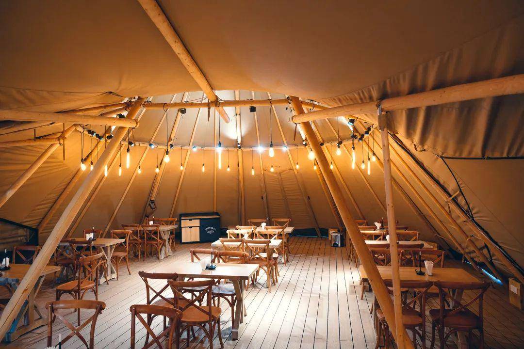 营地主帐采用顶级TentipiS72三连搭帐篷,可以根据天气可任意调节,性能优越,舒适感极高,可容纳百人就餐、会议、聚会。营地提供40顶丹麦顶级露营品牌大白熊Nordisk客房帐篷,帐内按五星级酒店客房标准配备各类设备设施,确保舒适度和品质感。