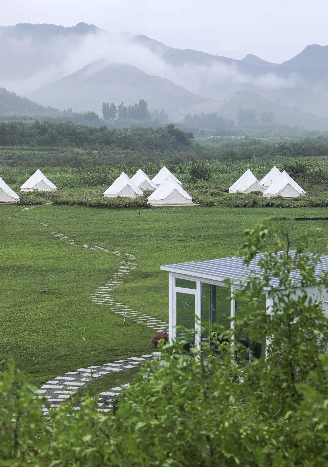 一片面积广袤的草场,也是一方天然的欢乐场。25顶帐篷立于错落分布的木质地台上,地台之间有石板小路相连,四周山野环绕、青草蓊勃,脚边有格桑花从土里探出头来。除了民宿,春山里还有多个不同主题的民宿可供选择。