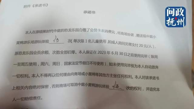 根据顾客提供的付款记录,对半折算一楼中庭小黄鸭乐园游玩体验次数给消费者,方案还约定小黄鸭乐园游玩体验有效期为6月7日至30日,限周一至周五使用,周六、周日及国家法定节假日不可使用,此外,体验单次限1名儿童使用,如成人陪同另需支付20元/人。