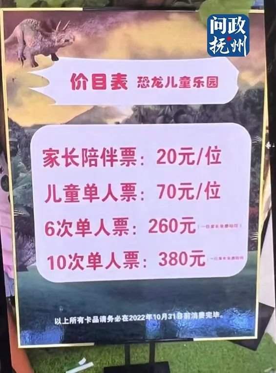 李经理表示,恐龙儿童乐园撤场前在乐园门口设有展示牌,提醒消费者在有效期内使用完。记者仔细观察硕果时代提供的展示牌图片,发现在该展示牌价目表最下方, 确实标有“以上所有卡品请务必在2022年10月31日前消费完毕”,但字体非常小。