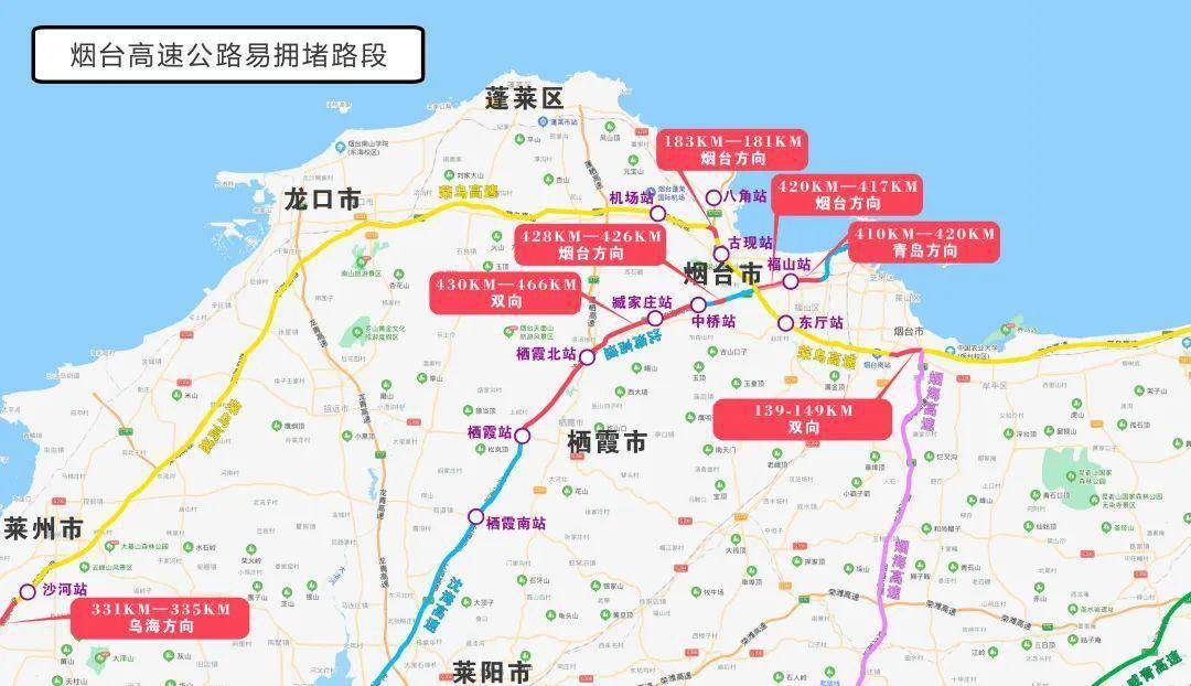 结合往年假期期间交通安全管理工作经验,G15沈海高速410KM-420KM青岛方向、420KM-417KM烟台方向、428KM-426KM烟台方向、430KM-466KM双向;G18荣乌高速139KM-149KM双向、183KM-181KM烟台方向、331KM-335KM乌海方向,车流量较大,易拥堵。