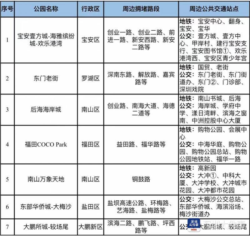 预计全市出行热度较高的公园有莲花山公园、深圳湾公园、广东梧桐山国家级森林公园、仙湖植物园等。预计全市出行热度较高的景点和商圈有宝安壹方城-海雅缤纷城-欢乐港湾、东门老街、后海海岸城、福田COCO Park、南山万象天地、东部华侨城-大梅沙、大鹏所城-较场尾等。这些热门片区周边地铁、公交、共享单车供给充足,建议市民优先选择公共交通方式绿色出行。