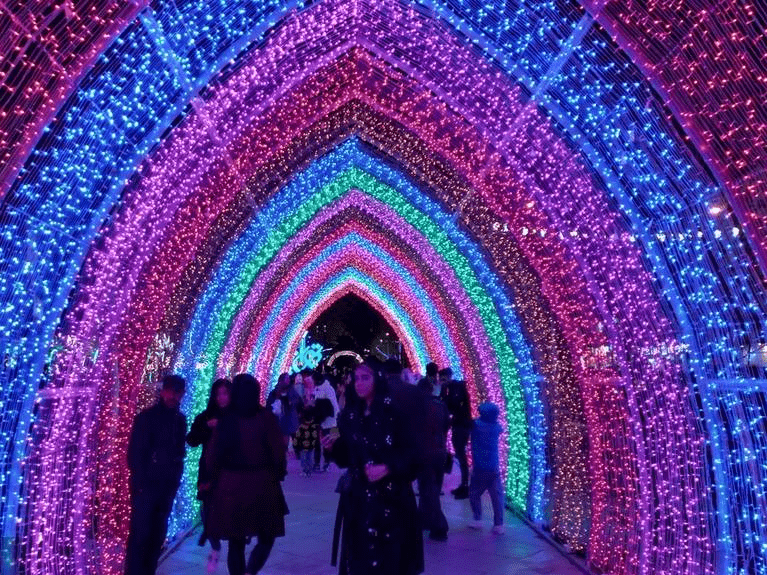 市民在漂亮的灯饰和幻彩灯光隧道旁拍照庆祝春天和斋月的开始。