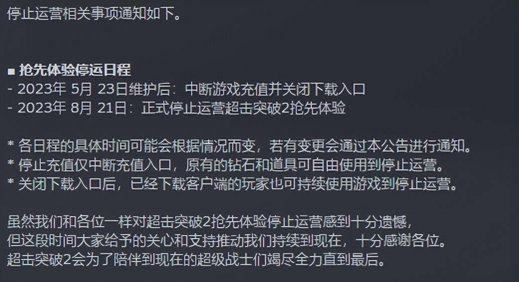 官方表示,团队一直努力调整游戏平衡并完善游戏环境,但目前剩余玩家数在持续减少。作为多人联机游戏,玩家数的减少必定会导致匹配时间的增加和难以进行公平匹配的问题,以至于无法呈现游戏的核心乐趣。剩余的玩家数也已经达到了无法持续运营的程度,因此决定停止运营抢先体验。