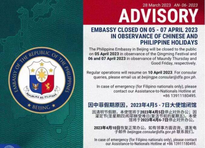 因中菲假期原因,2023年4月5-7日大使馆闭馆 。