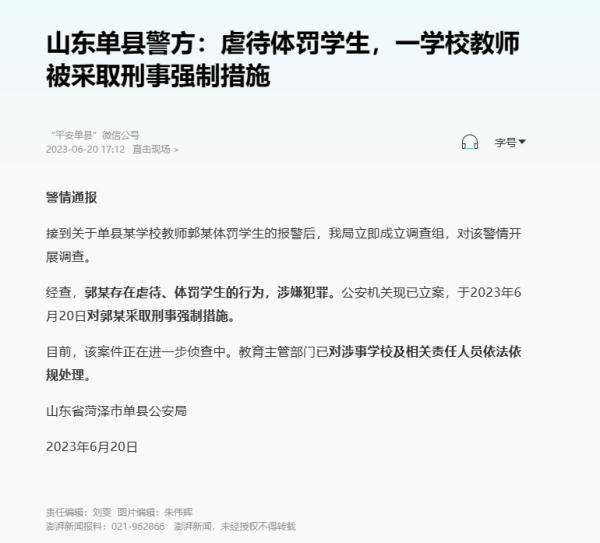 近期,类似的校园安全事件频发:6月20日,山东通报“教师体罚虐待学生”