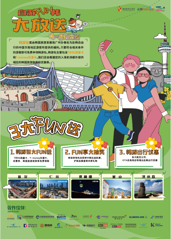 为进一步释放旅游活力,韩国旅游发展局于近日重磅开启“自游FUN韩·大放送”活动,不仅准备了流量卡、交通卡等实用礼包,让访韩旅程更加畅行无阻,更携手21个合作伙伴豪送中韩往返机票、名牌蓝牙耳机、高级护肤套装等好礼,多重惊喜不容错过!