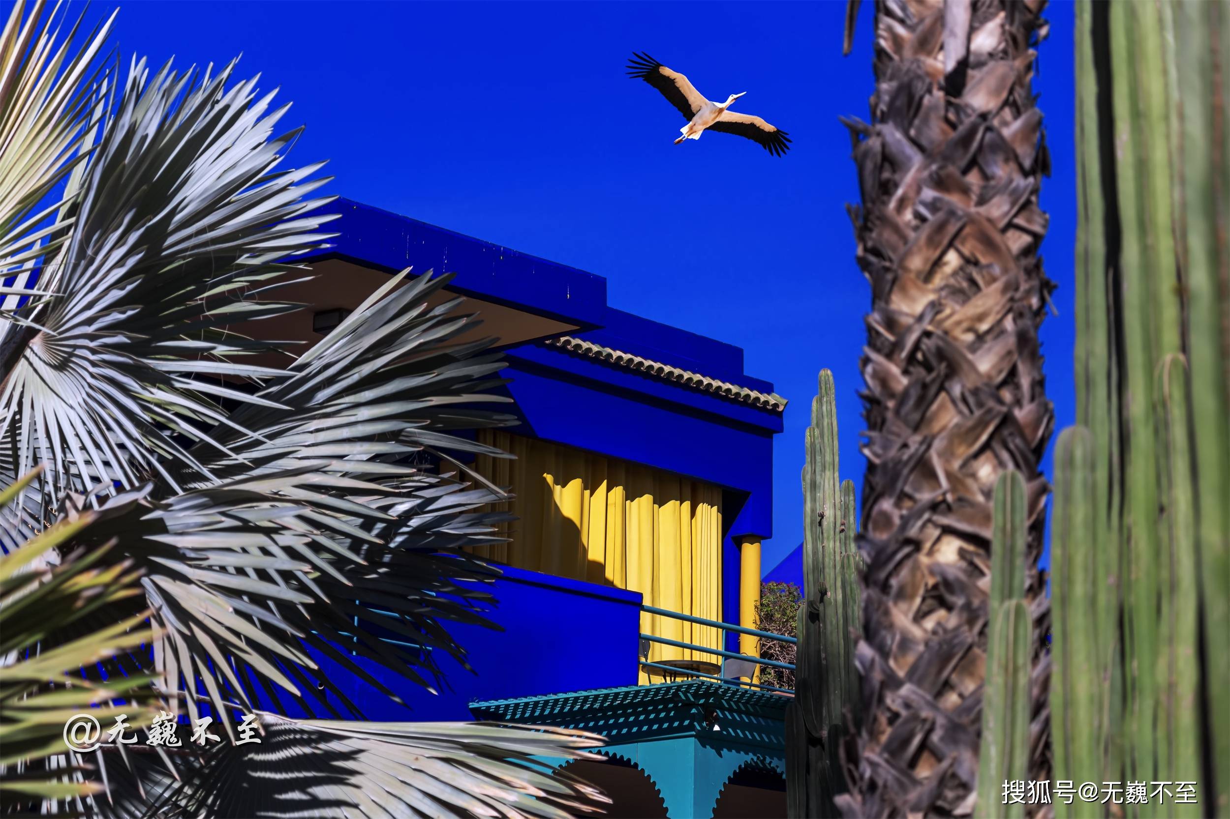 马约尔花园的特点在于只采用蓝、黄两种互搭色调并运用摩尔风格的镂空图案引导光线造成对比强烈、反差巨大的视觉冲击,成为无数美女青睐的网红打卡点。这种独特的蓝,又被称之为马约尔蓝,据说是从撒哈拉沙漠植物提炼出来,不仅价格不菲,也是其它任何颜料都模仿不来的。