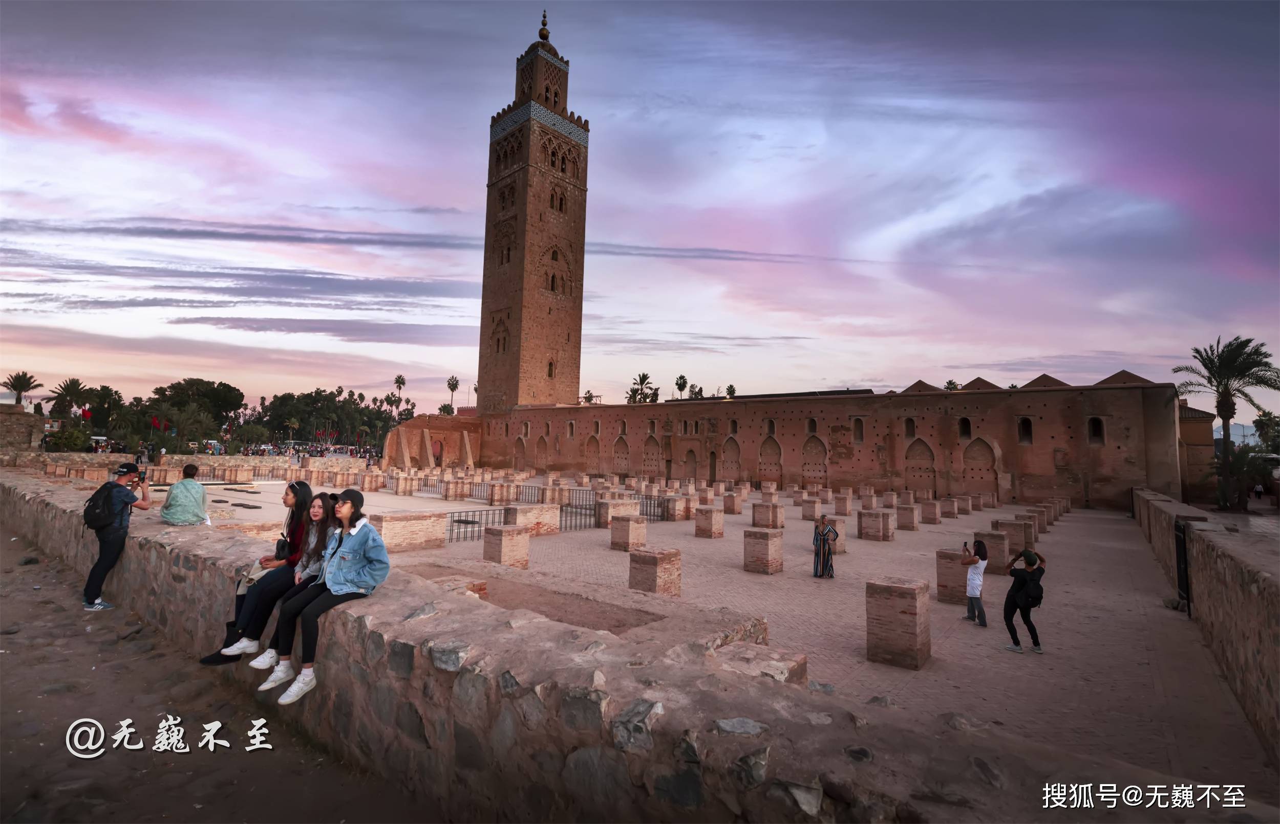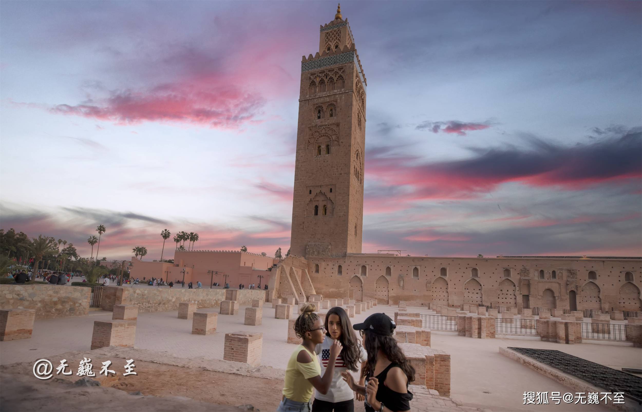 黄昏将近,马拉喀什的标志性建筑库图比亚清真寺如一柄利剑刺破夜空,在晚霞中熠熠生辉。库图比亚清真寺无疑是北非最美的清真寺,它的独特之处不仅是当年用近万袋名贵香料加入宣礼塔的黏土中,使得清真寺千百年来不断散发出淡淡的的袭人清香,享有“香塔”之称;它另一个独门秘笈便是在神龛凹室和两翼两跨周围开有采光槽,并垂直于麦加朝圣方向的17道柱廊,里面的"穆克纳斯"木结构蜂巢状雕饰美妙奇特,而这种工艺现已绝迹。