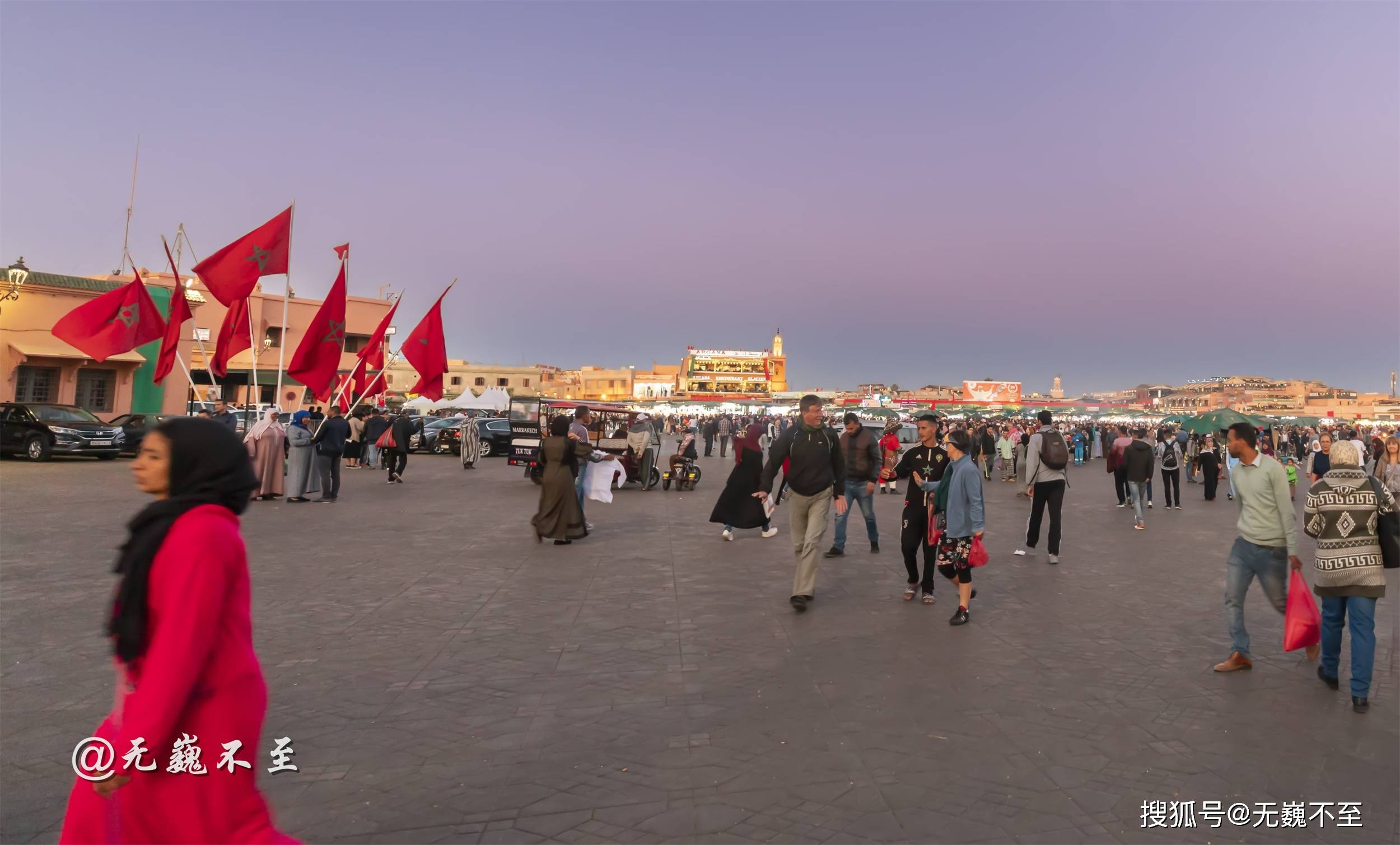 瑰丽的晚霞映红夜空,古雅的路灯和扇开的椰影在油浸浸的猩红色中显得失去稳重并稍带一点妖娆和魅惑,空气中除了五味杂陈的怪异香味,还夹藏着一股不安分的蠢蠢欲动——形形色色的人流开始不约而同从四面八方朝着库图比亚清真寺下方的德吉玛.埃尔法纳广场汇聚。