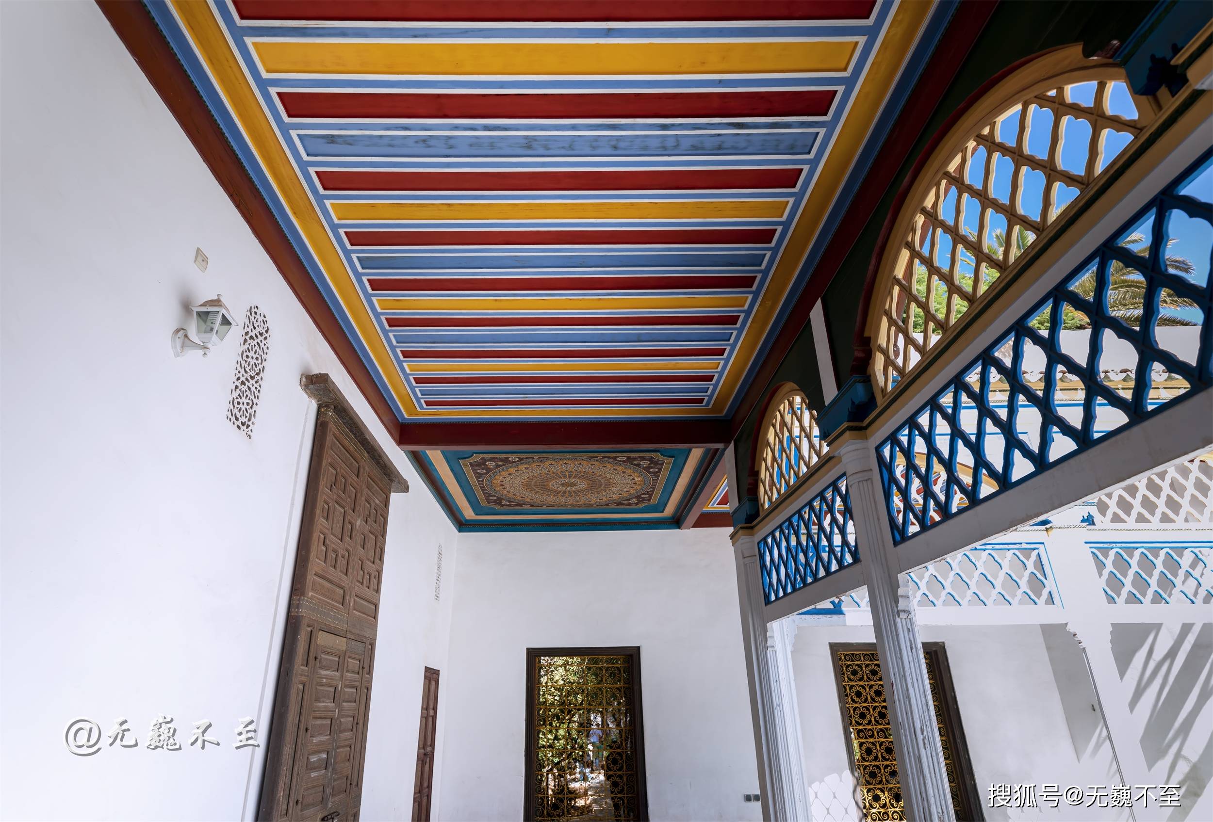 炽热的阳光斜斜洒满花园,斑驳的影子透过阿拉伯风格的窗棂映投在蓝色的墙面,深情绽放盛开的红、白、粉色三角梅,摄人心魄的Majorelle Blue(马约尔蓝),让这里充满着勃勃生机和安详静谧。
