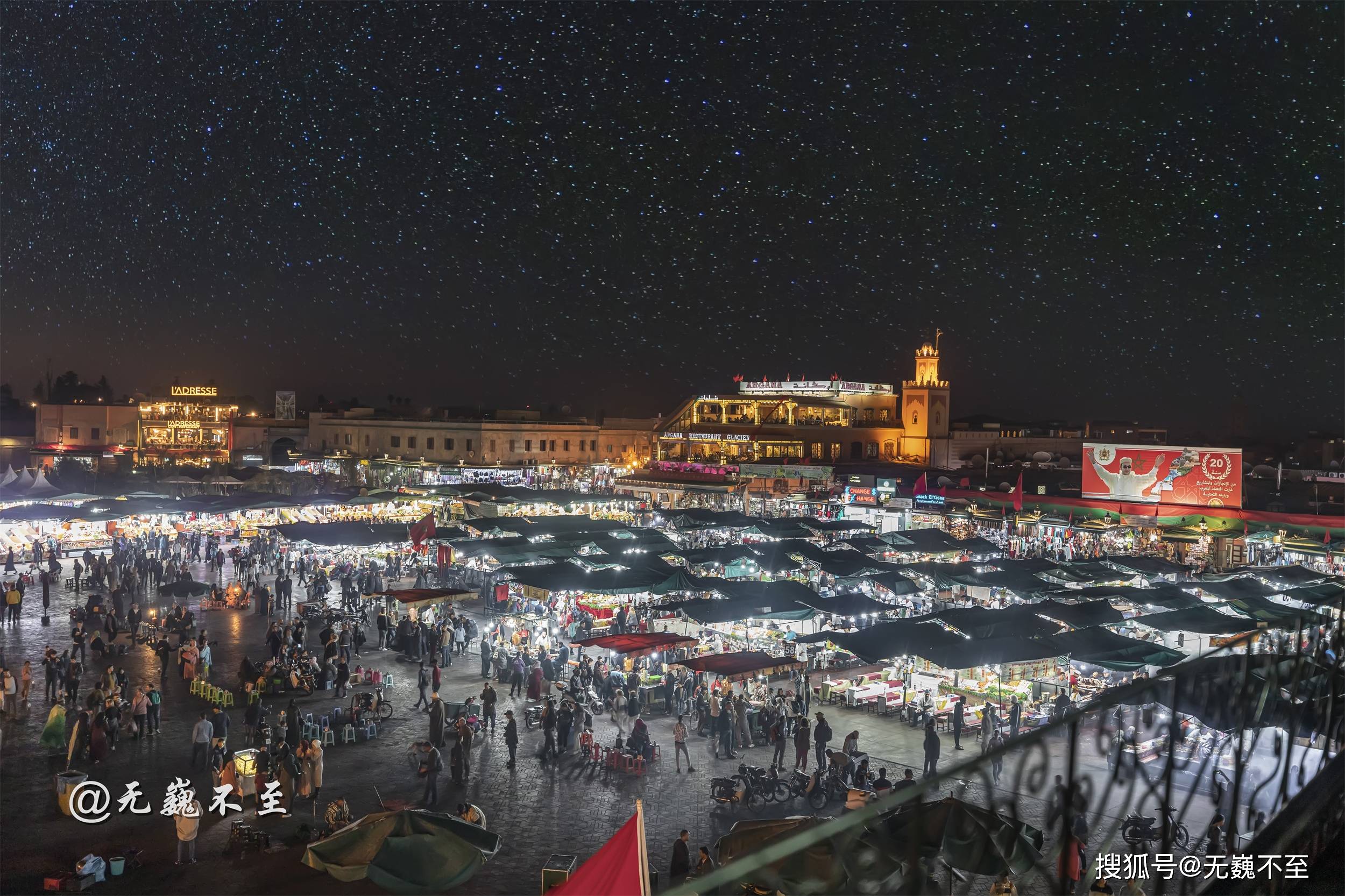 夜幕下仍保持着千年古貌的巨大广场又叫不眠广场或死亡广场,它是非洲最忙、最大的露天市场和柏柏尔人交易市场。1985年,广场被联合国教科文组织列入了世界非物质文化遗产名录。广场上耍蛇、玩猴、杂耍、演唱、吹奏、算卦、绘画、卖香料、卖水果、卖水的……这个地方不愧是一个鱼龙混杂、充满尔虞我诈、真诚和欺骗相互混战的冒险家乐园。