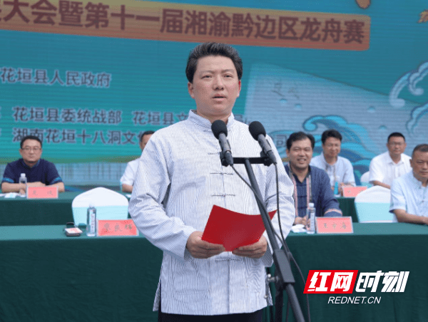 红网时刻新闻6月21日讯(通讯员 杨泽江 肖引霞 叶紫子萌 摄影 梁金梅 张晗 吴向申)首倡之地,逐浪边城。6月21日,花垣县第二届旅游发展大会暨第十一届湘渝黔边区龙舟赛活动在花垣县边城茶峒景区举行。来自全国各地的游客和三省市边区群众齐聚清水江畔,共享一场速度与激情的盛宴。县委书记廖良辉宣布活动开幕,县委副书记、县长王京海致辞。