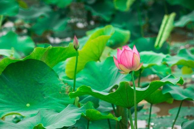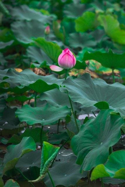 除了桂井,活发小镇附近也有一片荷塘,沿着长满荷叶的塘边搜寻,池塘边的荷叶中已长出三三两两的花骨朵,有的已经开始绽放,散发出一阵阵沁人心脾的荷花香。