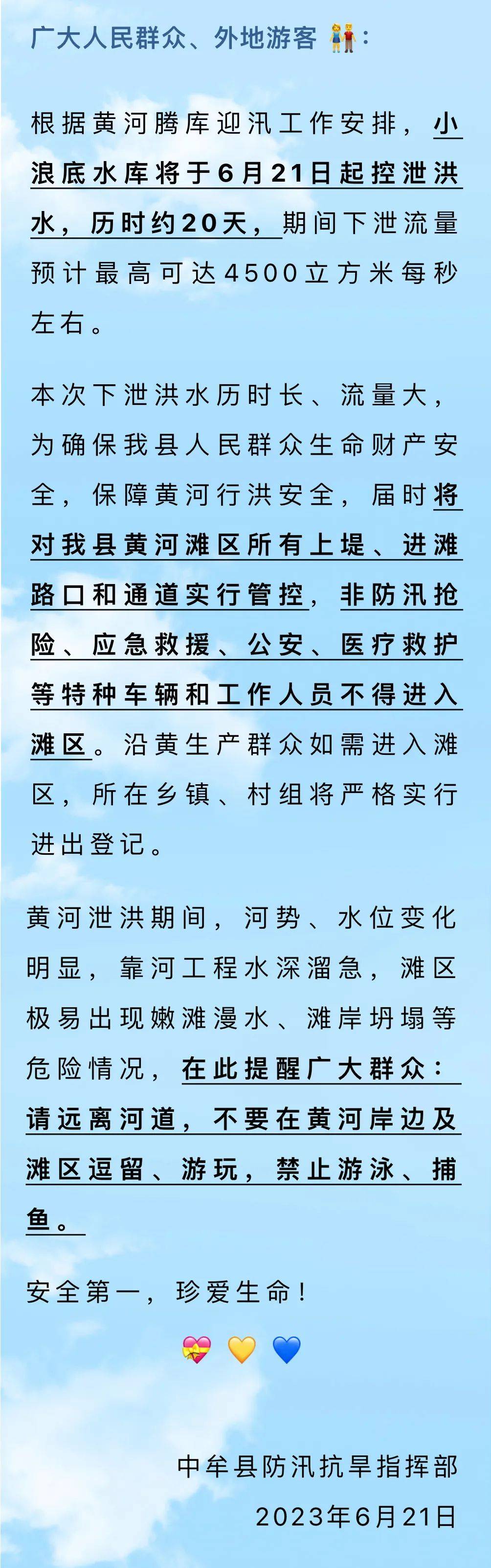 本次洪水下泄持续时间长,流量大。调水调沙期间,为确保人民群众生命财产安全,保障黄河行洪安全,黄河靠河区域将实行封控管理。封控区域内,除防汛抢险应急救援、公安、医疗救护等特种车辆和工作人员外,其他车辆、游客禁止入内。