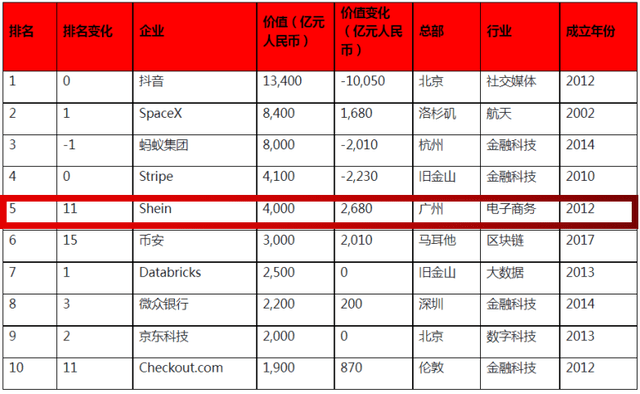 据胡润研究院《2022年中全球独角兽榜》显示,希音以4000亿元的估值位列全球第五,仅次于抖音、SpaceX、蚂蚁集团和Stripe。