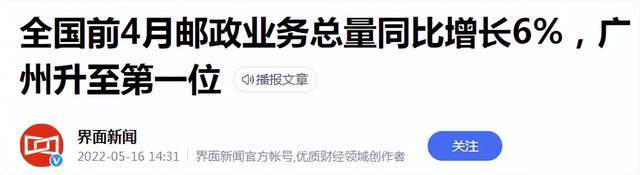 5月16日,国家邮政局公布了2022年4月邮政行业运行情况。从城市排名来看,广州市快递业务累计约32.32亿件,排名第一,金华(义乌)市快递业务累计约32.04亿件,排名第二位。深圳市排名第三、揭阳市排名第四、杭州市排名第五。