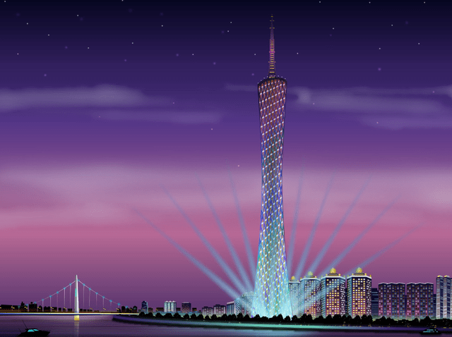 广州塔是广州的标志性建筑之一,也是世界第三高的电视塔,高593米。广州塔以其夜景而闻名。每当夜幕降临,塔上彩灯亮起,整座塔就像一朵美丽的花,在夜空中不停地绽放着美丽的光芒。人们会被它的美丽所吸引。