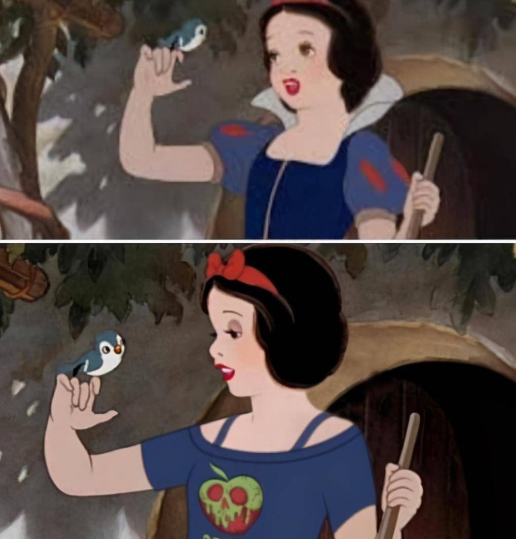 在原作动画中,白雪公主所穿的裙子看起来就像是一件连衣裙,非常漂亮。不过,我觉得这件T恤改了之后更符合我的审美。这件T恤是一件短袖T恤,下面还露出了肚脐。有设计感,还有点时尚感,这种衣服要是卖的话,我想朋友们会买的。