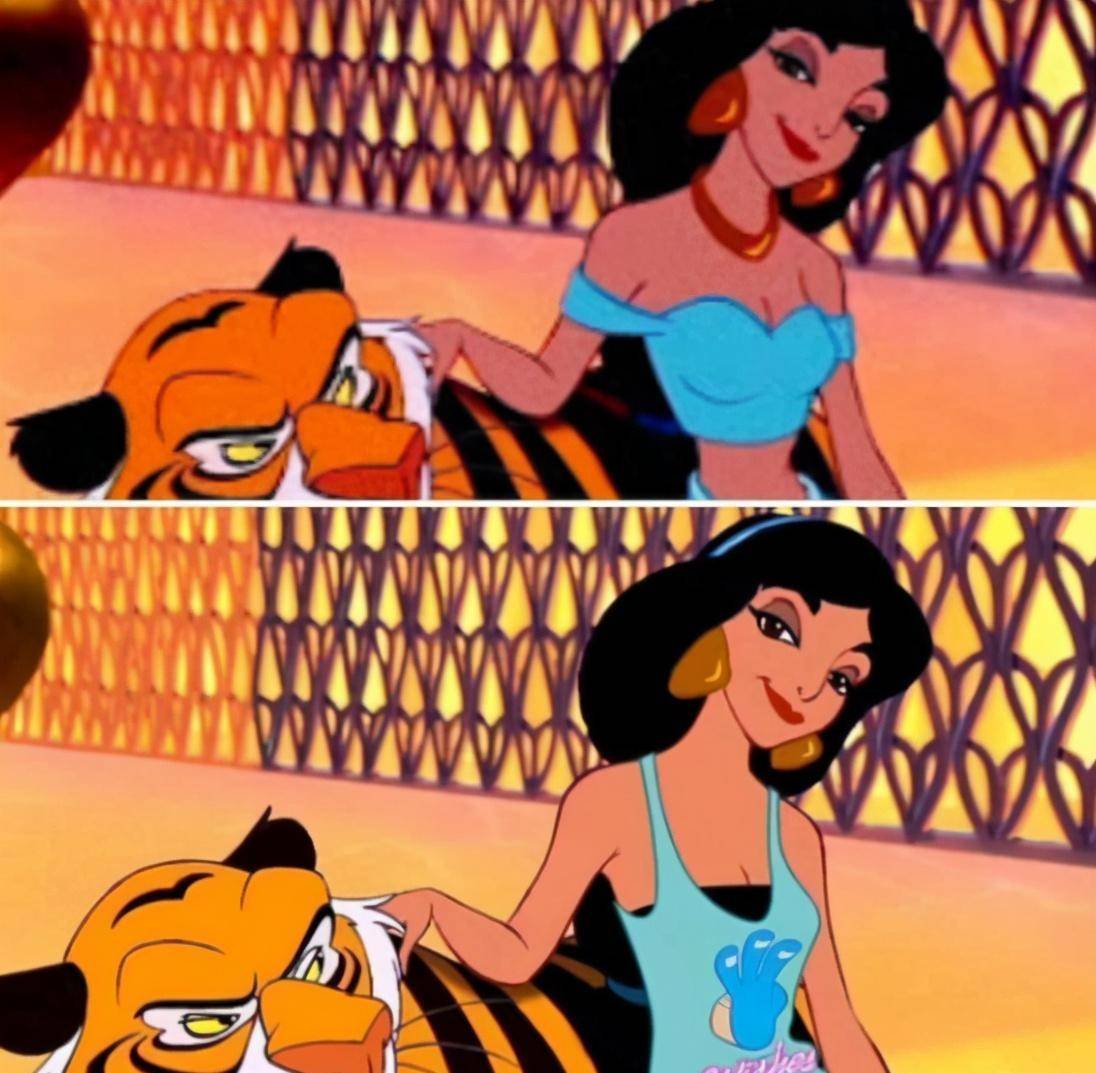 在原作动画中,人鱼公主爱丽儿在海里的时候,穿了一套非常有特色的装束,非常酷,看起来就像是泳装。变装的时候,她也换了一件和白雪公主一样的短T恤,只是颜色有点不同,反正还是很酷的。