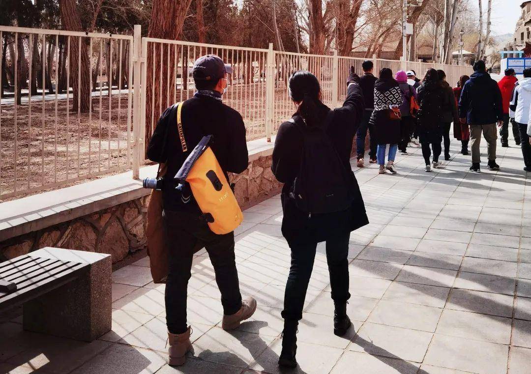第二天,清晨七点,戴着两层口罩走出了旅社,沙漠的四月依然很冷,我穿上了此行带的所有厚衣服,最保暖的当然就是羽绒背心,旅游淡季,气温也如此凉薄。到达莫高窟数字影院中心已是半小时后,检票排队的人群并没有少,原来淡季的少也如此的多。我赶紧取了票去排队,不想再让风带走我的体温。去石窟之前,游客先在数字影院观看两场介绍莫高窟的电影。这个月份出来游玩的,多是报团的中老人。工作人员将禁止线一经撤走,排队的人群快速地向影院涌进,中间位置早已被抢占,我在黑暗的影院寻找座位许久,无果。站在过道上不知所措,看到一个靠墙的位置已有人了,便在同排靠过道的位置坐下。坐在靠墙位置的那个人,脚旁边放着黄色的行囊,带着帽子,口罩,是看不清脸的,那份远离人群的倔强,让我记住了这个人。直到电影结束我们都没有说话,我想是不会再见面的,毕竟游客不算很少,又是分开乘坐大巴前往石窟。