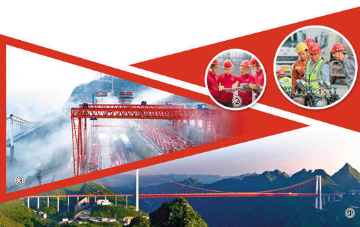 图①:贵州公路集团桥梁建设者在开展贝雷片荷载试验。 图②:贵州公路集团桥梁建设者在讨论施工方案。 图③:乌蒙山大桥桥梁预制场 图④:坝陵河大桥