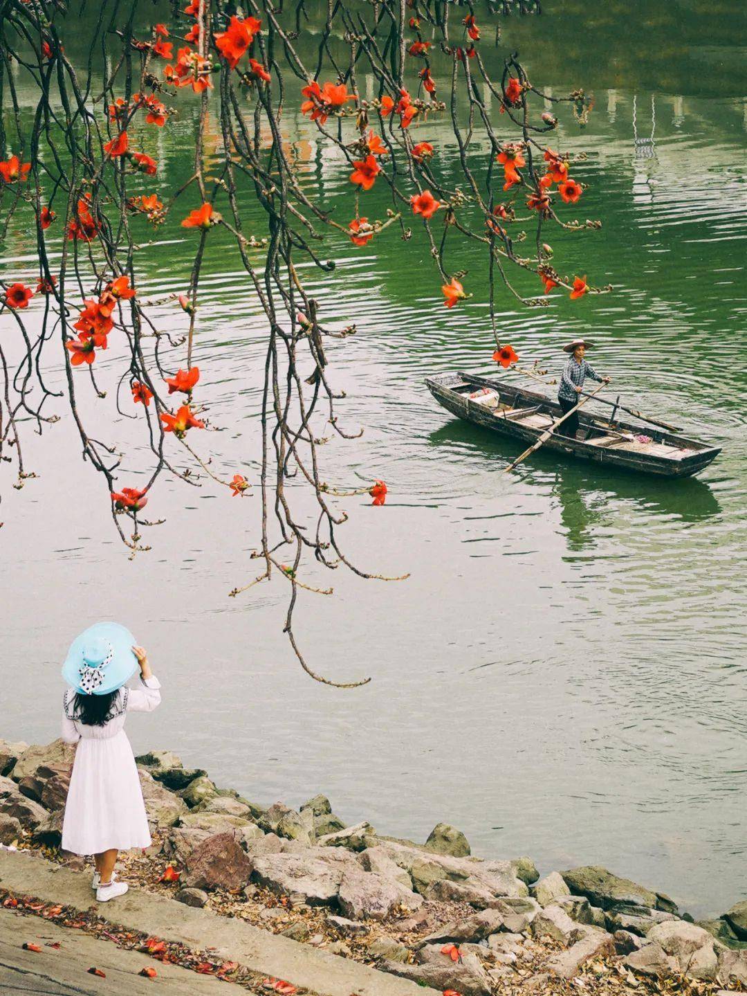 我困倦地坐着,终于下了车。按照导游的说法,我们又走了20分钟,终于到了乐北渡口。远远的就能看到河对岸的红木棉,每棵木棉树下都有一群人在拍照。