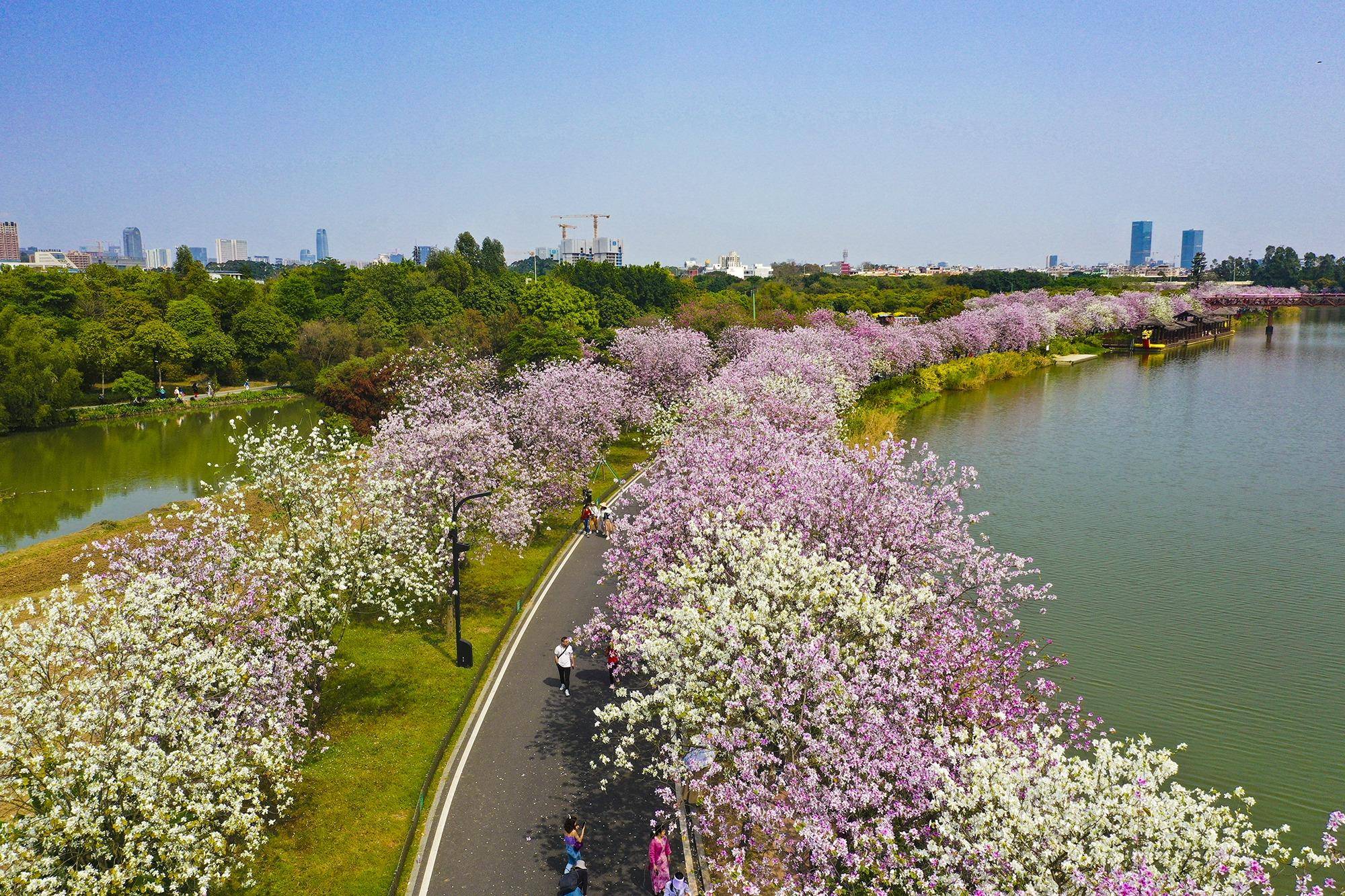 广东的春天真是花都,尤其是古城佛山,船票才50毛钱。可以乘船赏花。“花城”。春天,武汉的紫荆花开得像樱花一样鲜艳,于是我就去海珠湿地国家公园拍紫荆花。