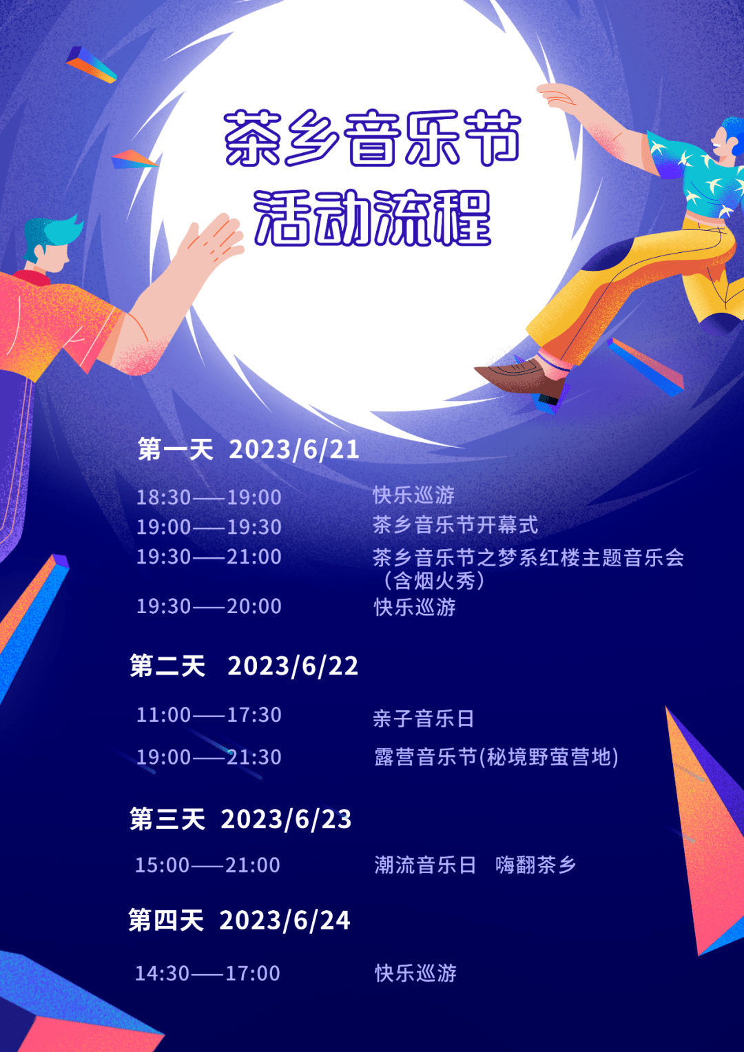 活动以黄龙岘特色茶文化为核心,“独特的茶乡文化”、“多元的音乐盛会”、“新奇的互动体验”三大特色板块为亮点,将与茶相关的非遗文化与艺术、社交等领域进行结合,围绕传统节日“端午”采用主题音乐会、露营音乐节、亲子嘉年华等多种创新形式,为游客们献上一场精彩的节日盛会。